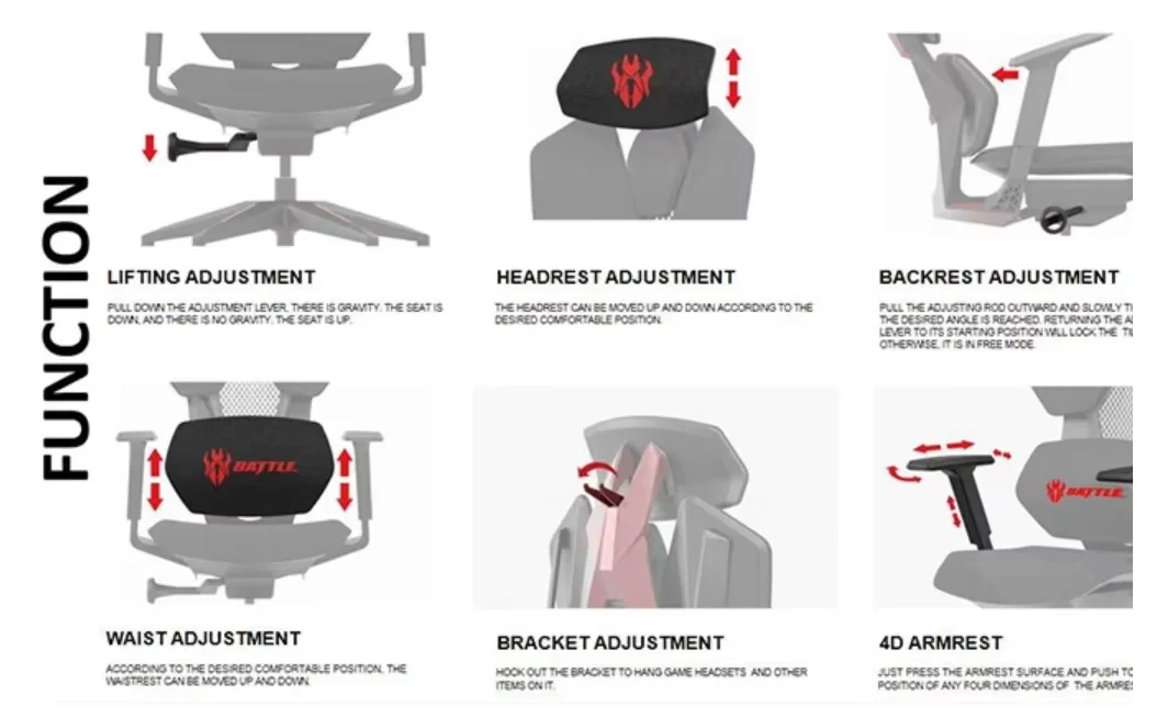 4.Le coussin peut être réglé en hauteur et en profondeur, et le dossier de la chaise peut être verrouillé en trois étapes ;