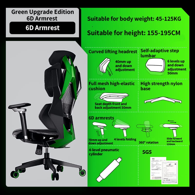 Fauteuil Gaming Ergonomique Moderne avec Accoudoirs 6D, Hauteur Réglable 125 cm, Inclinable, en Maille Noire et Grise, Fauteuil d’Ordinateur DIY en Maille Élastique de Polyuréthane
